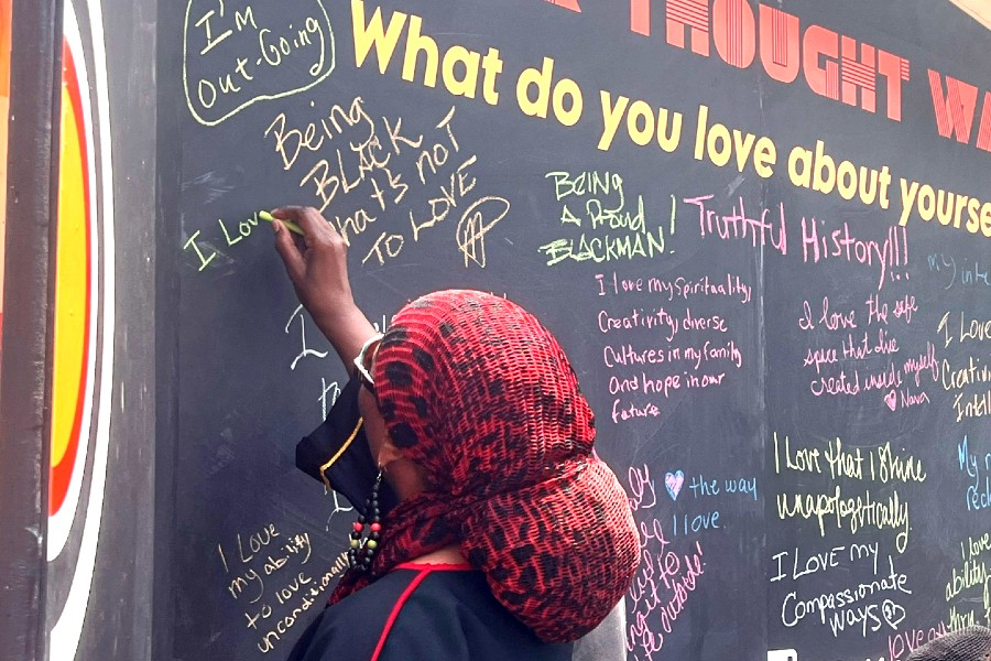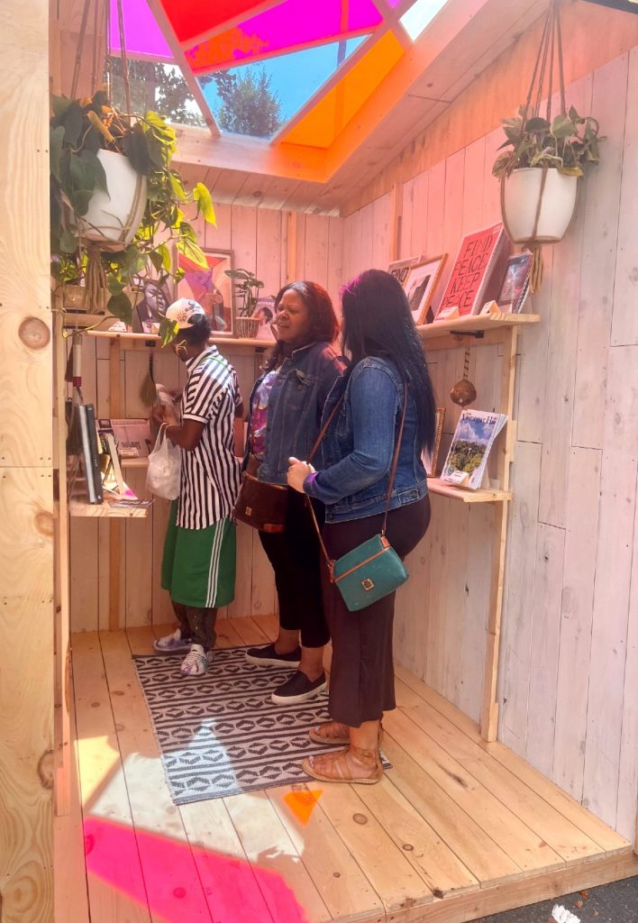 Hundreds of guests visited the exhibit during the week it was on display, reading curated Black-owned publications, meeting contributing artists, and speaking with organizers about the stories they want to see in the news. The installation included a Black Thought Wall where visitors could write directly on the outer walls of the newsstand in response to questions such as “What stories do you want to see” and “What do you love about yourself?”